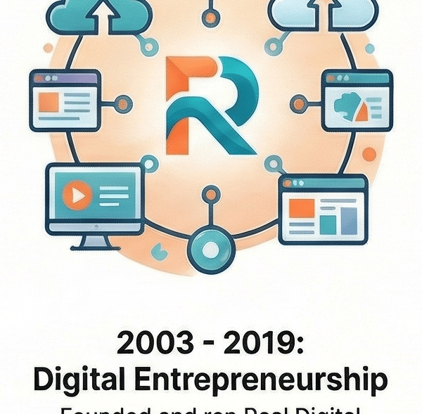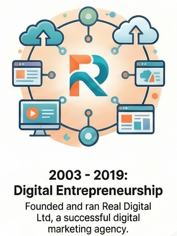 Founded in 2003 and run successfully until late 2018, Real Digital Ltd evolved from a company focused on building websites into a full-service digital agency. Rick guided clients through successive waves of digital transformation, including the rise of Google search, the complexities of Search Engine Optimization (SEO), the new landscape of online advertising, and the emergence of social media marketing. At its peak, the agency grew to include ten employees serving 250 ongoing clients, a testament to its effectiveness and market reputation. As Founder and Managing Director, his responsibilities were comprehensive, encompassing business management, sales, marketing strategy, and a commitment to constant personal and professional upskilling.