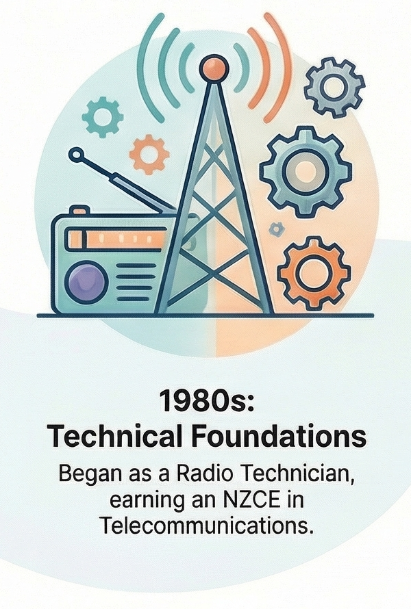 Rick began his career as a Radio Technician with the NZPO and later worked as a Radio Inspector. During this time, he was directly involved in the development of remote radio systems designed to overcome the geographical limitations of the existing copper wire network. This project was a direct precursor to the mobile telephone network in New Zealand, marking his first foray into a world-changing technology and establishing a career-long pattern as an early adopter. His technical qualifications from this period include: