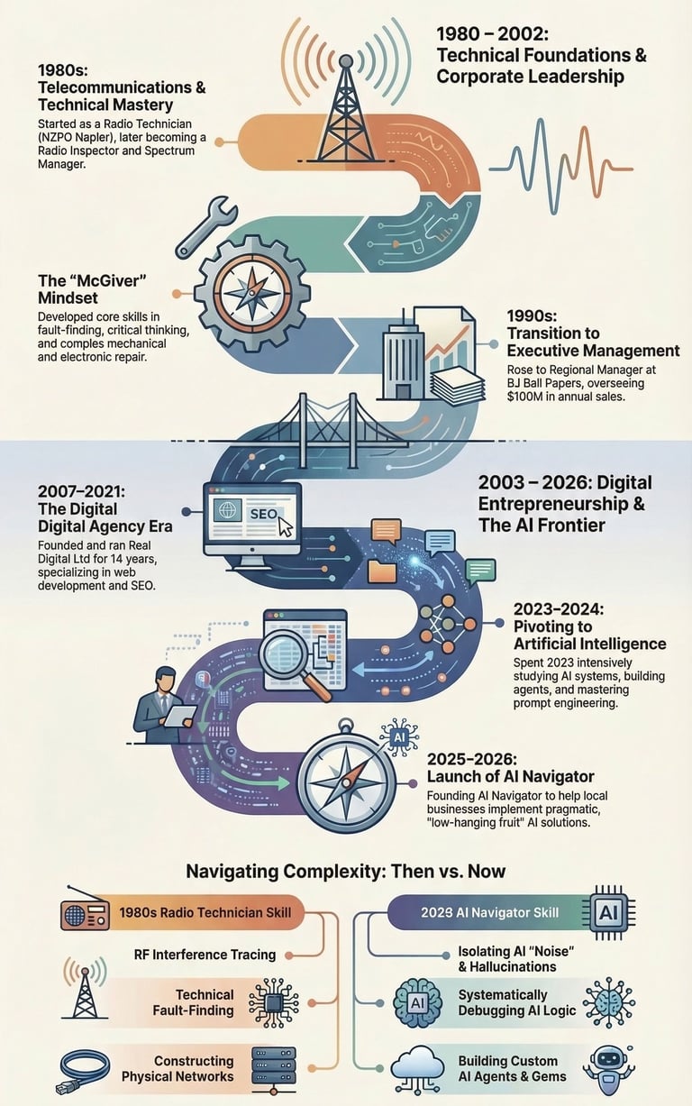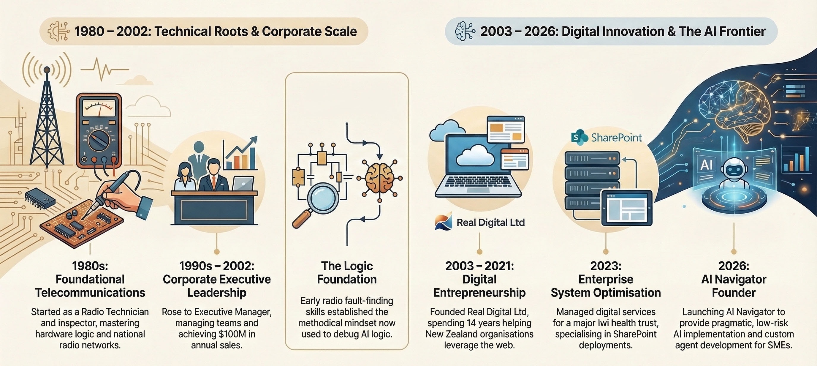 I started my full-time career in January 1980 when I joined the Radio Section of the New Zealand Post Office in Napier as a trainee radio technician, straight from finishing high school. At the time I had worked steadily in after school jobs requiring independent thought and responsibility since I was 13 years old and already had a strong work ethic.