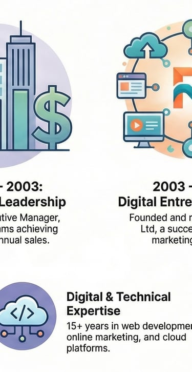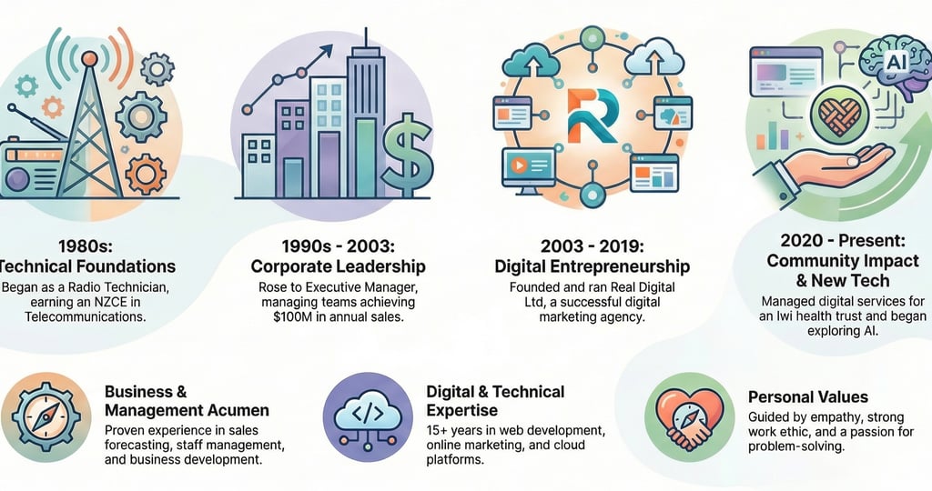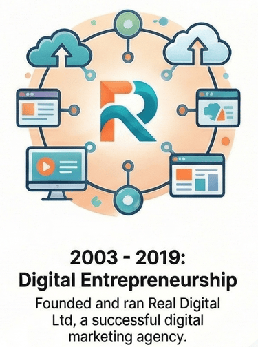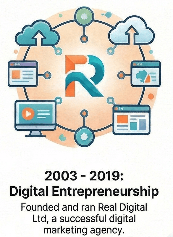Founded in 2003 and run successfully until late 2018, Real Digital Ltd evolved from a company focused on building websites into a full-service digital agency. Rick guided clients through successive waves of digital transformation, including the rise of Google search, the complexities of Search Engine Optimization (SEO), the new landscape of online advertising, and the emergence of social media marketing. At its peak, the agency grew to include ten employees serving 250 ongoing clients, a testament to its effectiveness and market reputation. As Founder and Managing Director, his responsibilities were comprehensive, encompassing business management, sales, marketing strategy, and a commitment to constant personal and professional upskilling.