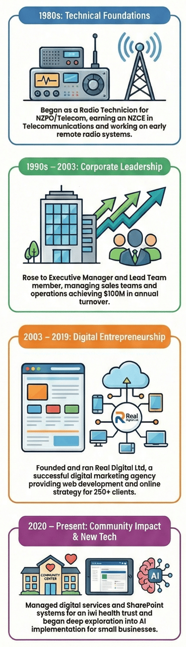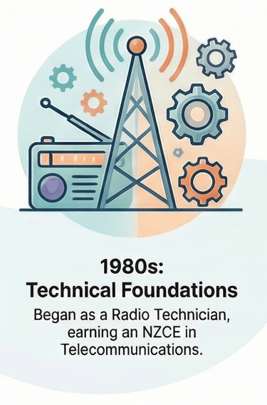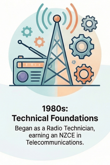 Rick began his career as a Radio Technician with the NZPO and later worked as a Radio Inspector. During this time, he was directly involved in the development of remote radio systems designed to overcome the geographical limitations of the existing copper wire network. This project was a direct precursor to the mobile telephone network in New Zealand, marking his first foray into a world-changing technology and establishing a career-long pattern as an early adopter. His technical qualifications from this period include: